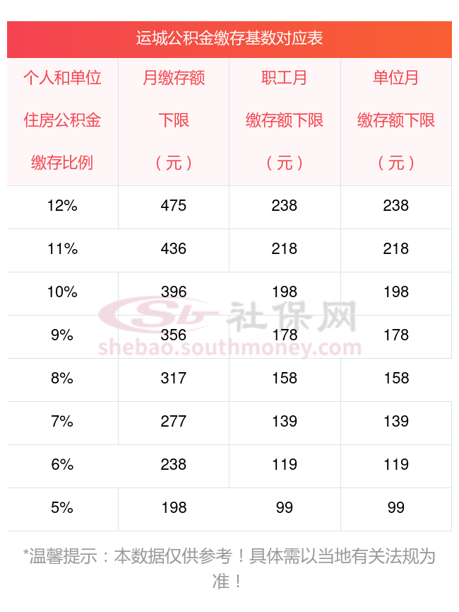 住房公积金缴存比例为各5%的,对应的住房公积金月缴存额下限为99元。
