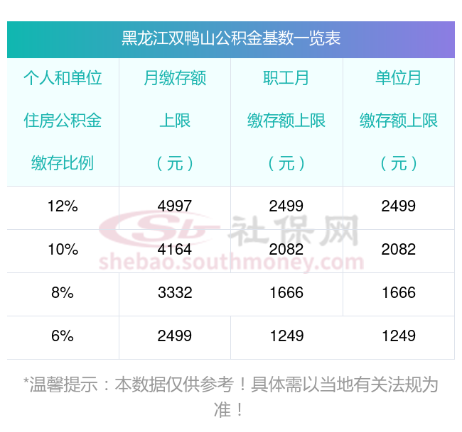 如何计算自己缴纳的住房公积金多少钱?住房公积金计算方法是什么呢?按照什么基数标准计算的?2025年黑龙江双鸭山最新公积金的缴存基数是多少?下面随社保网小编一起来了解一下。
