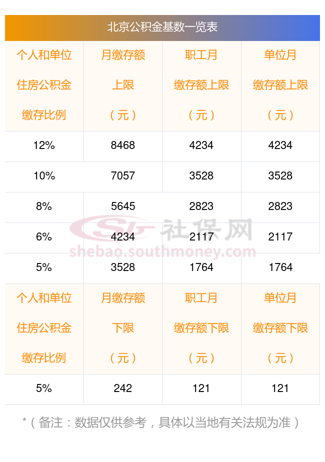 2025年北京公积金缴存基数上限下限对照表,上限比例对比缴存基数表: