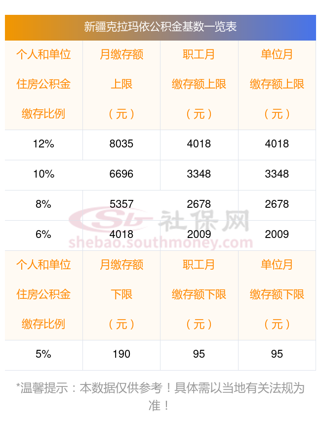 每年住房公积金的调整,现在部分城市住房公积金调整了住房缴存基数、缴存比例,并相应的对最高最低缴存标准作了调整,那来看看2024年-2025年新疆克拉玛依的最新公积金缴存基数是多少?