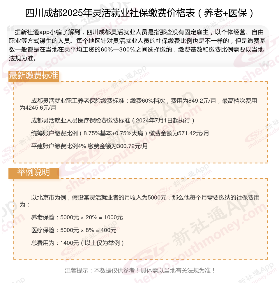 灵活就业社保是指针对灵活就业人员的社会保险制。灵活就业人员包括个体经营者、自由职业者、临时工等,他们没有固定的雇主,因此需要自行缴纳社会保险。那么2025年四川成都灵活就业人员社保需要交多少钱?下面随新社通小编一起来看看。