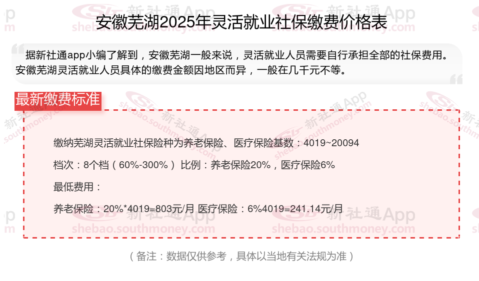 以上就是安徽芜湖灵活就业社保缴费的全部内容,数据及内容供参考!希望对你有帮助,欢迎关注新社通app解锁更多社保专业资讯。