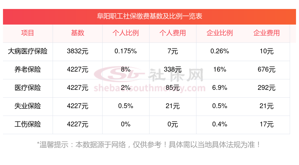 阜阳职工社保缴费多少钱?阜阳职工社保缴费基数最新参考为:3579.00,具体如下: