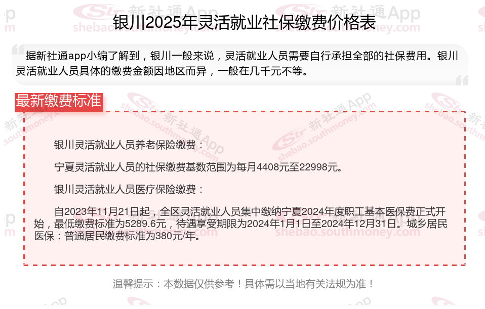 随着经济的发展和社会的进步,灵活就业人员越来越多,但是很多人不知道如何缴纳社保。本文将介绍2025年银川灵活就业人员社保缴费基数及如何缴纳社保,能领取多少钱,帮助大家更好地了解灵活就业社保,随着新社通APP小编一起了解银川灵活就业社保缴费最新资讯吧。