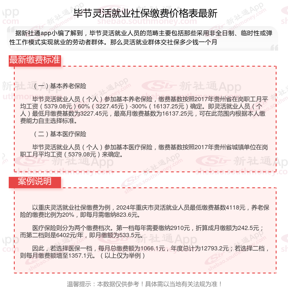 一、2024年毕节灵活就业社保缴费标准表 毕节灵活就业社保多少钱一个月?