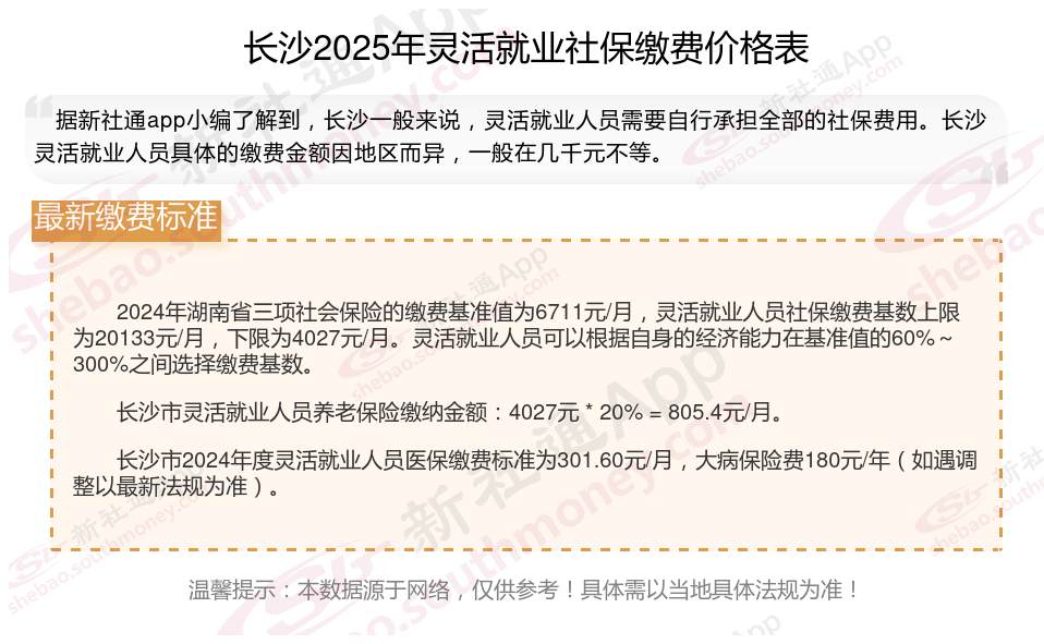灵活就业社保通常只需缴纳养老和医疗两项(部分地区可自愿选缴失业险),其他险种无需强制缴纳。灵活就业社保缴费满15年后,退休后可领取养老金,避免老年无收入来源。那么2025年长沙灵活就业人员社保需要交多少钱?下面随新社通小编一起来看看。