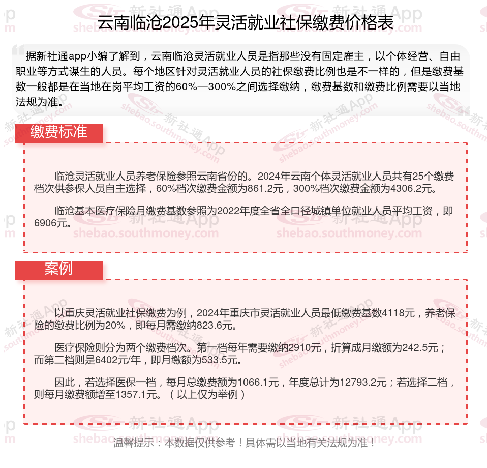 以上就是带来云南临沧灵活就业社保缴费标准相关知识,内容供参考,希望对你有帮助,欢迎关注/下载新社通app解锁更多社保专业资讯。