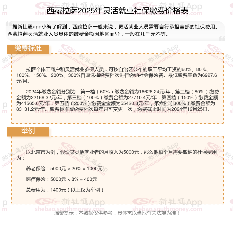 2025年西藏拉萨灵活就业人员社保需要交多少钱?随着经济社会的不断发展,灵活就业群体也日益壮大,其社保缴费问题也愈发受到关注。接下来随新社通APP小编一起来看看灵活就业群体社保缴费问题吧。