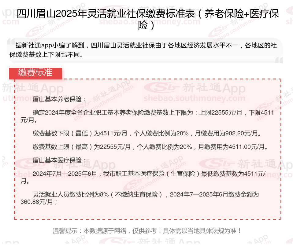 2025年四川眉山灵活就业人员社保交多少钱,你了解2025年四川眉山灵活就业人员社保缴费基数及比例吗,据新社通小编了解到,灵活就业社保缴费标准每年都会有所调整,主要体现在缴费基数和缴费比例上。接下来随新社通APP小编一起来看看。