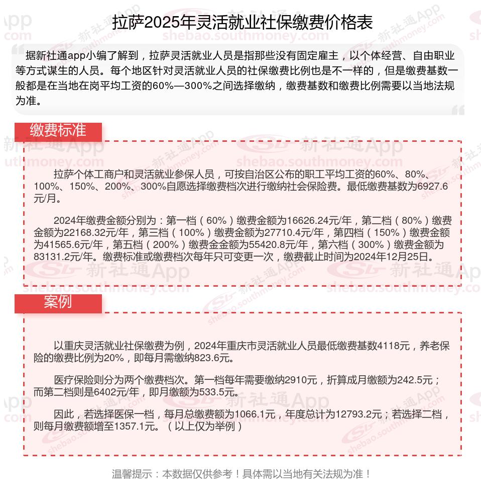 二、拉萨2024年灵活就业社保缴费基数、比例最新消息