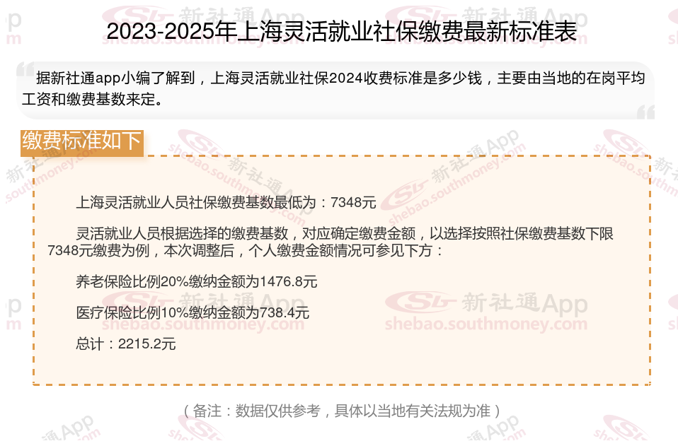 上海灵活就业社保2025年收费标准是多少钱,主要由当地的在岗平均工资和缴费基数来定。其次,灵活就业社保缴纳跟职工缴纳不同的地方在于,灵活就业社保参保只能参保养老保险和医疗保险,且缴纳比例完全由个人承担。另外,灵活就业人员社保参保选择,可自由选择参保城镇职工社保和城乡居民保险。2025年上海灵活就业社保缴多少钱?如何缴纳?怎么计算待遇?新社通APP小编将在下文为您详细说明。