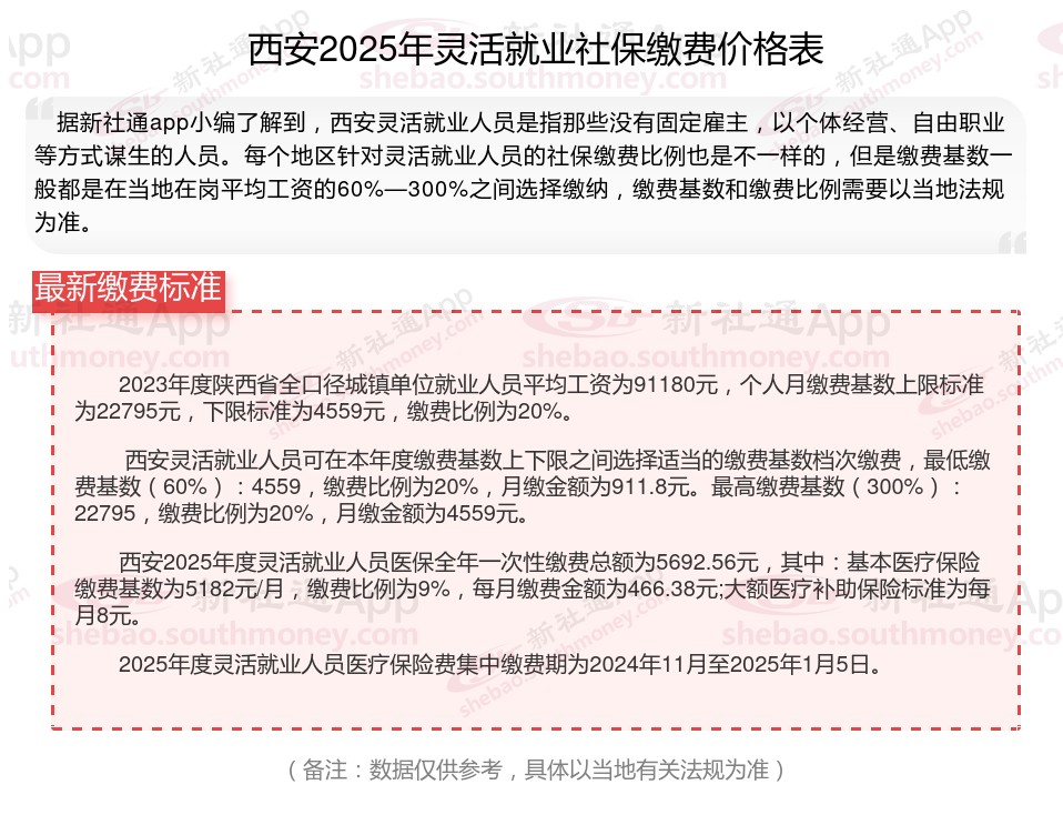 以上就是带来西安灵活就业社保缴费标准相关知识,内容供参考,希望对你有帮助,欢迎关注/下载新社通app解锁更多社保专业资讯。