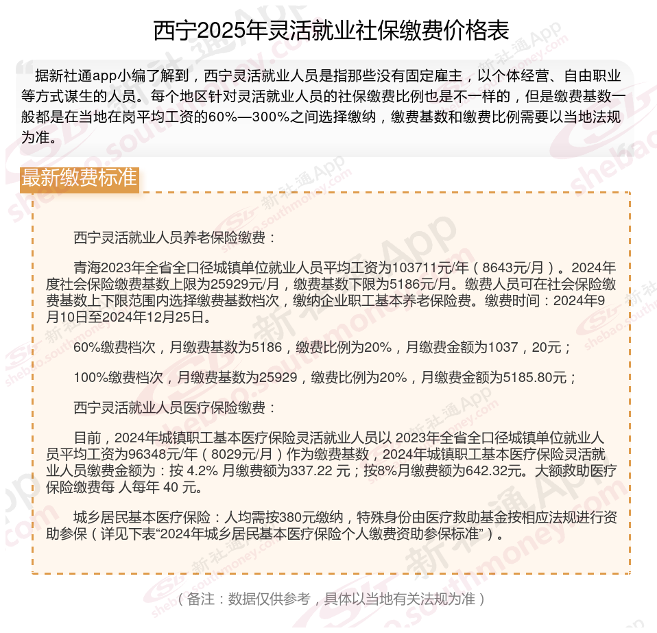 西宁灵活就业社保2025年收费标准是多少钱,主要由当地的在岗平均工资和缴费基数来定。其次,灵活就业社保缴纳跟职工缴纳不同的地方在于,灵活就业社保参保只能参保养老保险和医疗保险,且缴纳比例完全由个人承担。另外,灵活就业人员社保参保选择,可自由选择参保城镇职工社保和城乡居民保险。2025年西宁灵活就业社保缴多少钱?如何缴纳?怎么计算待遇?新社通APP小编将在下文为您详细说明。