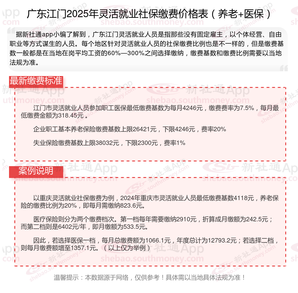 随着经济社会的不断发展,灵活就业群体不断地日益壮大,其社保缴费问题也愈发受到关注。那么2025年广东江门灵活就业人员社保交多少钱,你了解2025年广东江门灵活就业人员社保缴费基数及比例吗,接下来随新社通APP小编一起来看看。