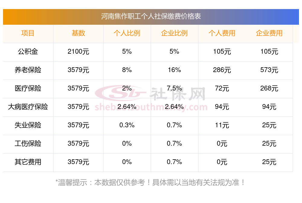 河南焦作职工社保缴费多少钱?河南焦作职工社保缴费基数最新参考为:3579.00,具体如下:
