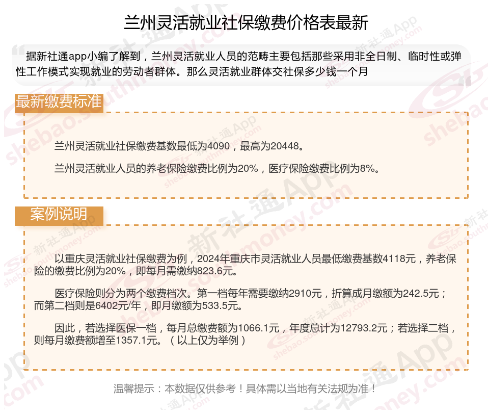 一、2024年兰州灵活就业社保缴费标准表 兰州灵活就业社保多少钱一个月?