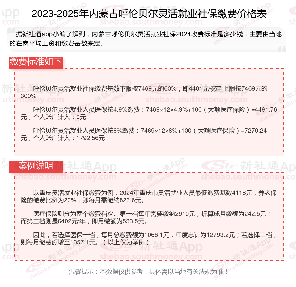 以上就是内蒙古呼伦贝尔灵活就业社保缴费的全部内容,数据及内容供参考!希望对你有帮助,欢迎关注新社通app解锁更多社保专业资讯。