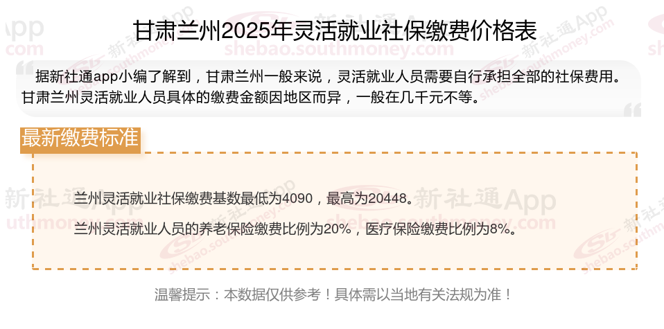 以上就是甘肃兰州灵活就业社保缴费的全部内容,数据及内容供参考!希望对你有帮助,欢迎关注新社通app解锁更多社保专业资讯。