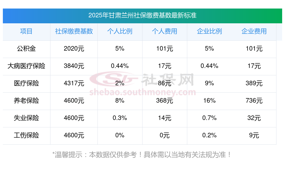 甘肃兰州社保缴费多少钱一个月?2024-2025年社保缴费最新标准参照如下: 职工社保缴费基数为:4600.00元