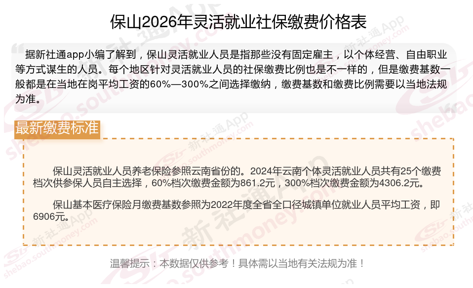 二、2026年保山灵活就业社保缴费标准表 保山灵活就业社保多少钱一个月?