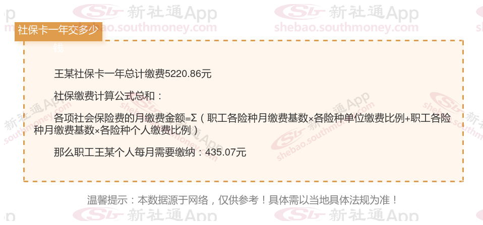 由上图得知,王某社保卡一年需要缴纳5220.86元,职工个人月缴纳435.07元,若您想要了解明细点击新社通社保计算器,来了解一下明细吧。