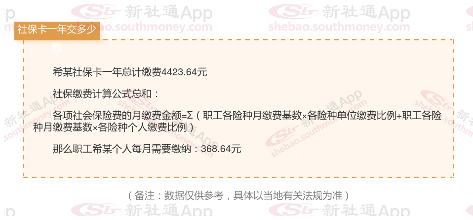 由上图得知,希某社保卡一年需要缴纳4423.64元,个人部分每月需要缴纳368.64元,若您想要了解明细点击新社通社保计算器,来了解一下明细吧。