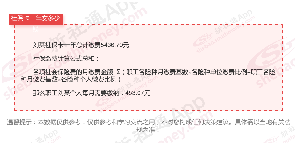 由上图得知,刘某社保卡一年需要缴纳5436.79元,职工个人月缴纳453.07元,若您想要了解明细点击新社通社保计算器,来了解一下明细吧。