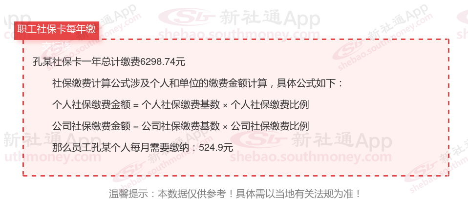 以上就是孔某职工社保卡一年缴费金额的全部内容,希望对您有帮助,欢迎关注新社通app解锁更多社保专业资讯。