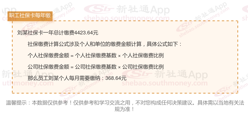 由上图得知,刘某社保卡一年需要缴纳4423.64元,职工个人月缴纳368.64元,若您想要了解明细点击新社通社保计算器,来了解一下明细吧。