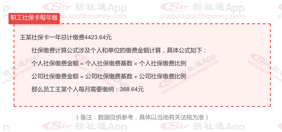 由上图得知,王某社保卡一年需要缴纳4423.64元,职工个人月缴纳368.64元,若您想要了解明细点击新社通社保计算器,来了解一下明细吧。