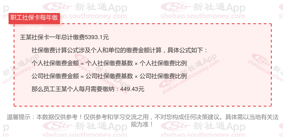 由上图得知,王某社保卡一年需要缴纳5393.1元,职工个人月缴纳449.43元,若您想要了解明细点击新社通社保计算器,来了解一下明细吧。