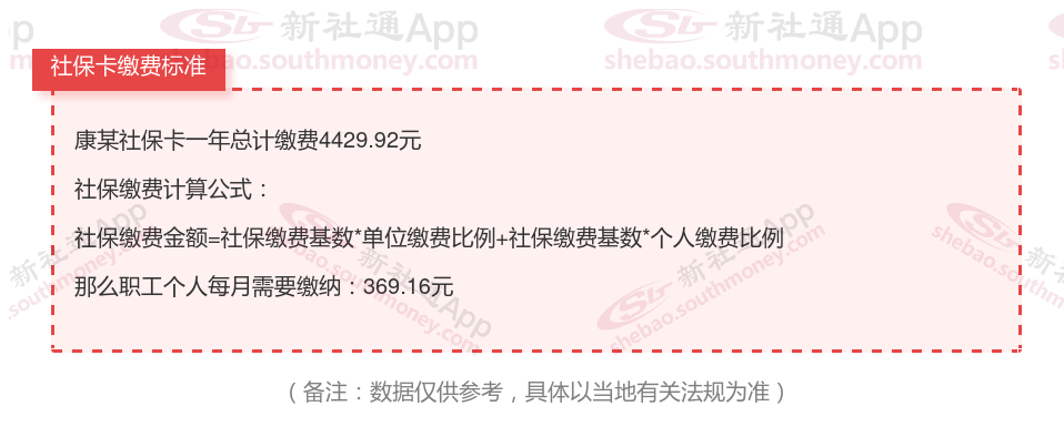 由上图得知,康某社保卡一年需要缴纳4429.92元,职工个人月缴纳369.16元,若您想要了解明细点击新社通社保计算器,来了解一下明细吧。
