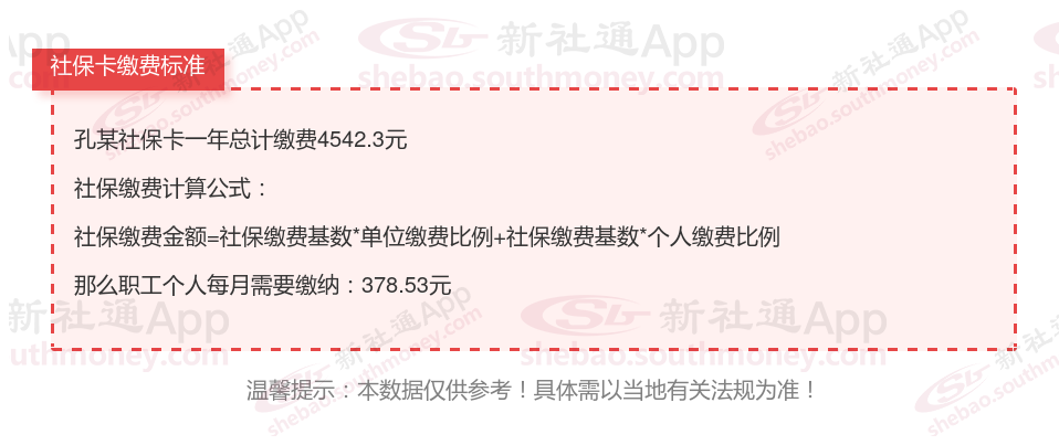 由上图得知,孔某社保卡一年需要缴纳4542.3元,个人部分每月需要缴纳378.53元,若您想要了解明细点击新社通社保计算器,来了解一下明细吧。