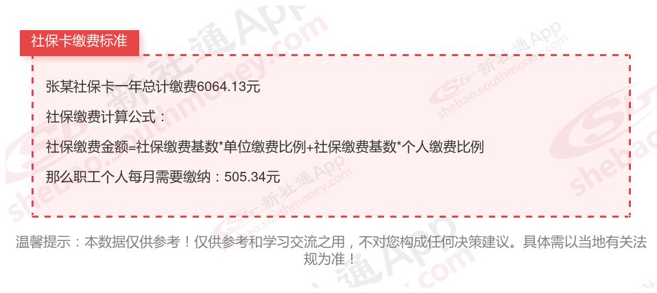 由上图得知,张某社保卡一年需要缴纳6064.13元,职工个人月缴纳505.34元,若您想要了解明细点击新社通社保计算器,来了解一下明细吧。