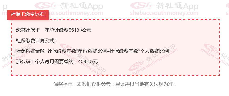 由上图得知,沈某社保卡一年需要缴纳5513.42元,个人部分每月需要缴纳459.45元,若您想要了解明细点击新社通社保计算器,来了解一下明细吧。