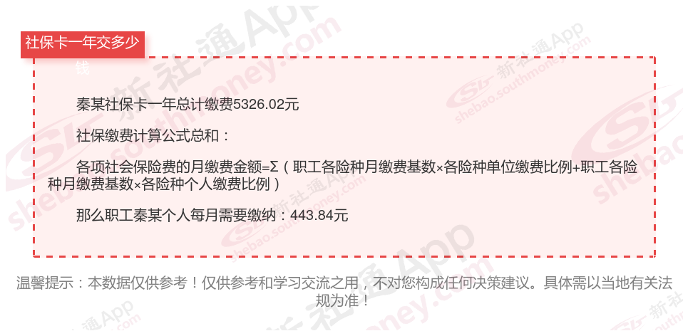 由上图得知,秦某社保卡一年需要缴纳5326.02元,职工个人月缴纳443.84元,若您想要了解明细点击新社通社保计算器,来了解一下明细吧。