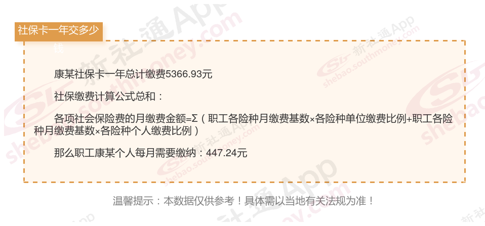 由上图得知,康某社保卡一年需要缴纳5366.93元,职工个人月缴纳447.24元,若您想要了解明细点击新社通社保计算器,来了解一下明细吧。