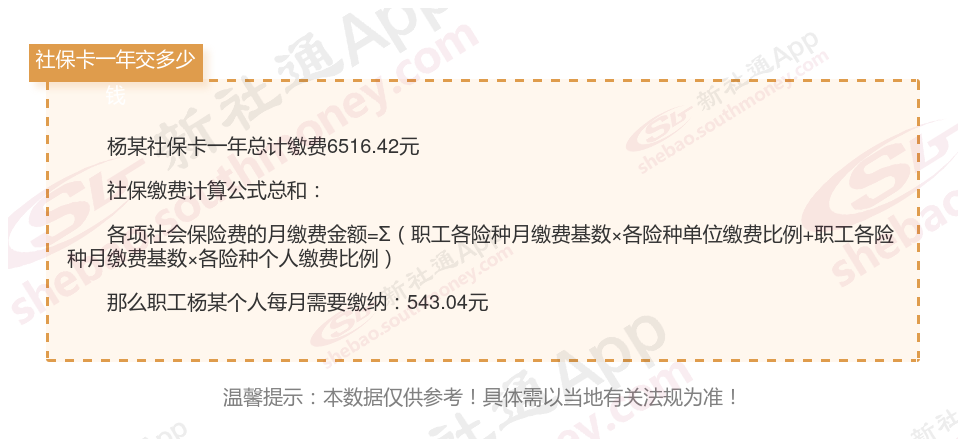 由上图得知,杨某社保卡一年需要缴纳6516.42元,职工个人月缴纳543.04元,若您想要了解明细点击新社通社保计算器,来了解一下明细吧。