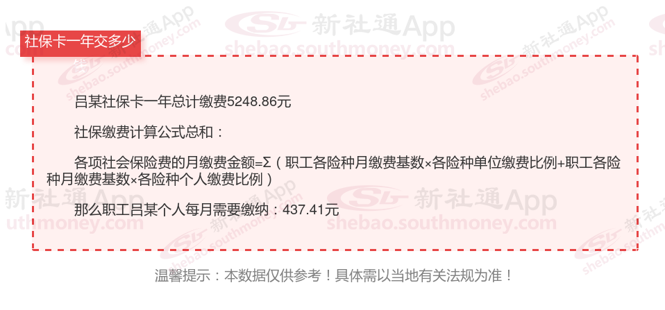 由上图得知,吕某社保卡一年需要缴纳5248.86元,个人部分每月需要缴纳437.41元,若您想要了解明细点击新社通社保计算器,来了解一下明细吧。