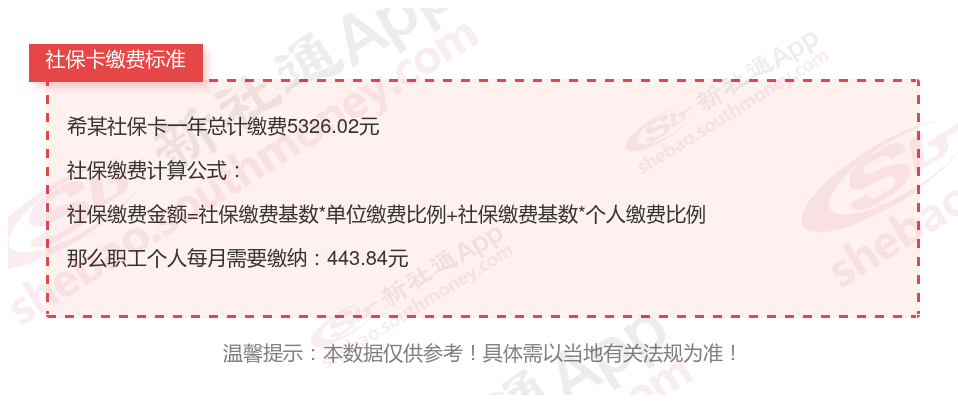由上图得知,希某社保卡一年需要缴纳5326.02元,职工个人月缴纳443.84元,若您想要了解明细点击新社通社保计算器,来了解一下明细吧。