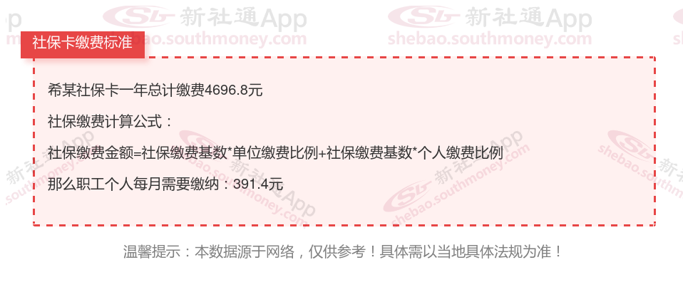 由上图得知,希某社保卡一年需要缴纳4696.8元,职工个人月缴纳391.4元,若您想要了解明细点击新社通社保计算器,来了解一下明细吧。