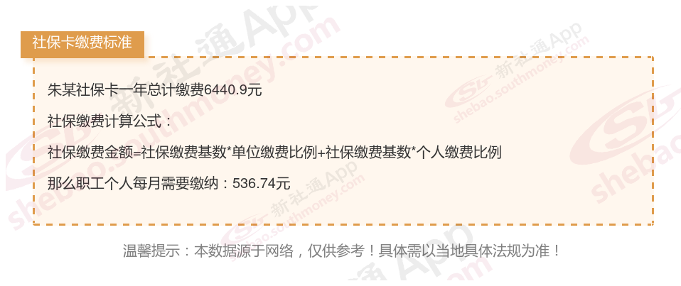 由上图得知,朱某社保卡一年需要缴纳6440.9元,职工个人月缴纳536.74元,若您想要了解明细点击新社通社保计算器,来了解一下明细吧。