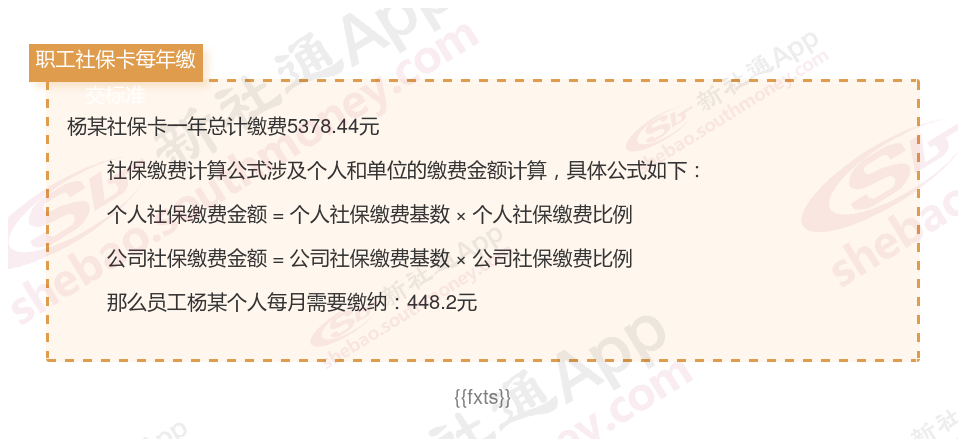 由上图得知,杨某社保卡一年需要缴纳5378.44元,职工个人月缴纳448.2元,若您想要了解明细点击新社通社保计算器,来了解一下明细吧。