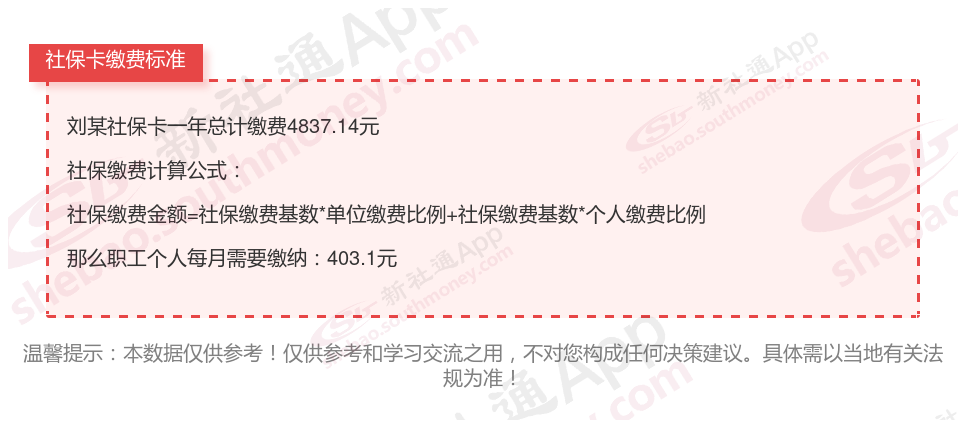 由上图得知,刘某社保卡一年需要缴纳4837.14元,个人部分每月需要缴纳403.1元,若您想要了解明细点击新社通社保计算器,来了解一下明细吧。