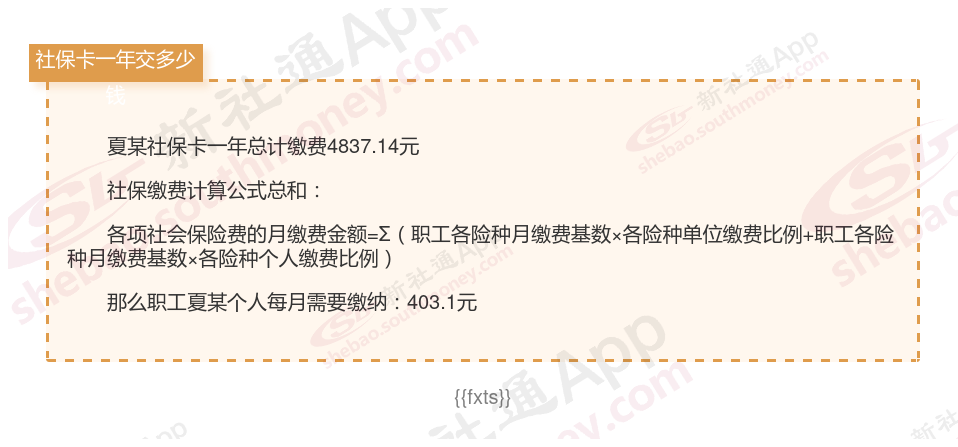 由上图得知,夏某社保卡一年需要缴纳4837.14元,职工个人月缴纳403.1元,若您想要了解明细点击新社通社保计算器,来了解一下明细吧。
