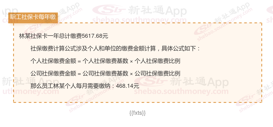 由上图得知,林某社保卡一年需要缴纳5617.68元,个人部分每月需要缴纳468.14元,若您想要了解明细点击新社通社保计算器,来了解一下明细吧。