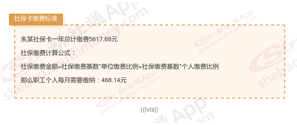 由上图得知,朱某社保卡一年需要缴纳5617.68元,职工个人月缴纳468.14元,若您想要了解明细点击新社通社保计算器,来了解一下明细吧。