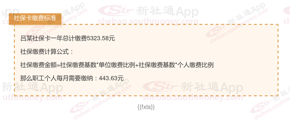 由上图得知,吕某社保卡一年需要缴纳5323.58元,职工个人月缴纳443.63元,若您想要了解明细点击新社通社保计算器,来了解一下明细吧。