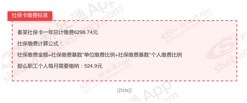 由上图得知,秦某社保卡一年需要缴纳6298.74元,个人部分每月需要缴纳524.9元,若您想要了解明细点击新社通社保计算器,来了解一下明细吧。