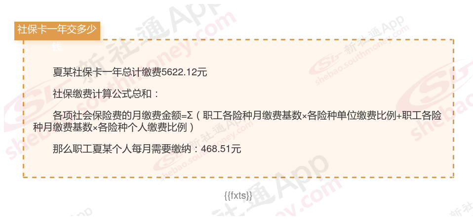 由上图得知,夏某社保卡一年需要缴纳5622.12元,职工个人月缴纳468.51元,若您想要了解明细点击新社通社保计算器,来了解一下明细吧。